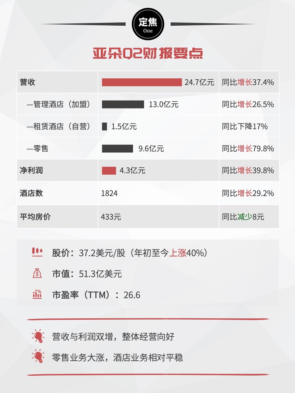 报告期内,亚朵集团实现营收24.69亿元,同比增长37.4%;净利润4.25亿元,同比增长39.8%。截至二季度末,亚朵集团注册会员人数1.02亿,同比增长34.7%。
