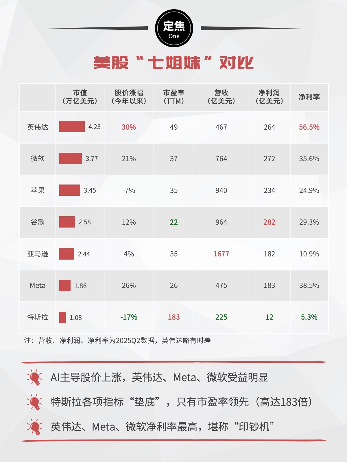 七巨头各有赚钱密码:英伟达卖AI算力,微软控制企业级软件生态,苹果靠高端消费电子,谷歌掌握信息入口,亚马逊既卖货也做云,Meta打广告赚钱,特斯拉还是靠卖车。