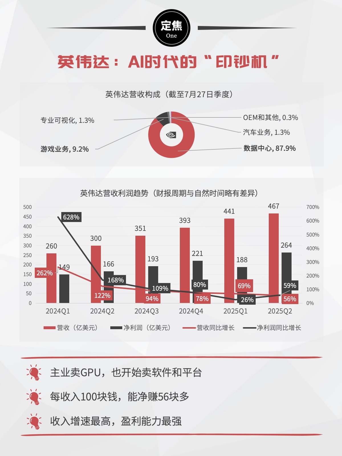 英伟达做游戏显卡起家,AI浪潮让它成为最会赚钱的卖铲人,全世界的科技公司都从它手里买GPU,给它贡献了近九成收入。
