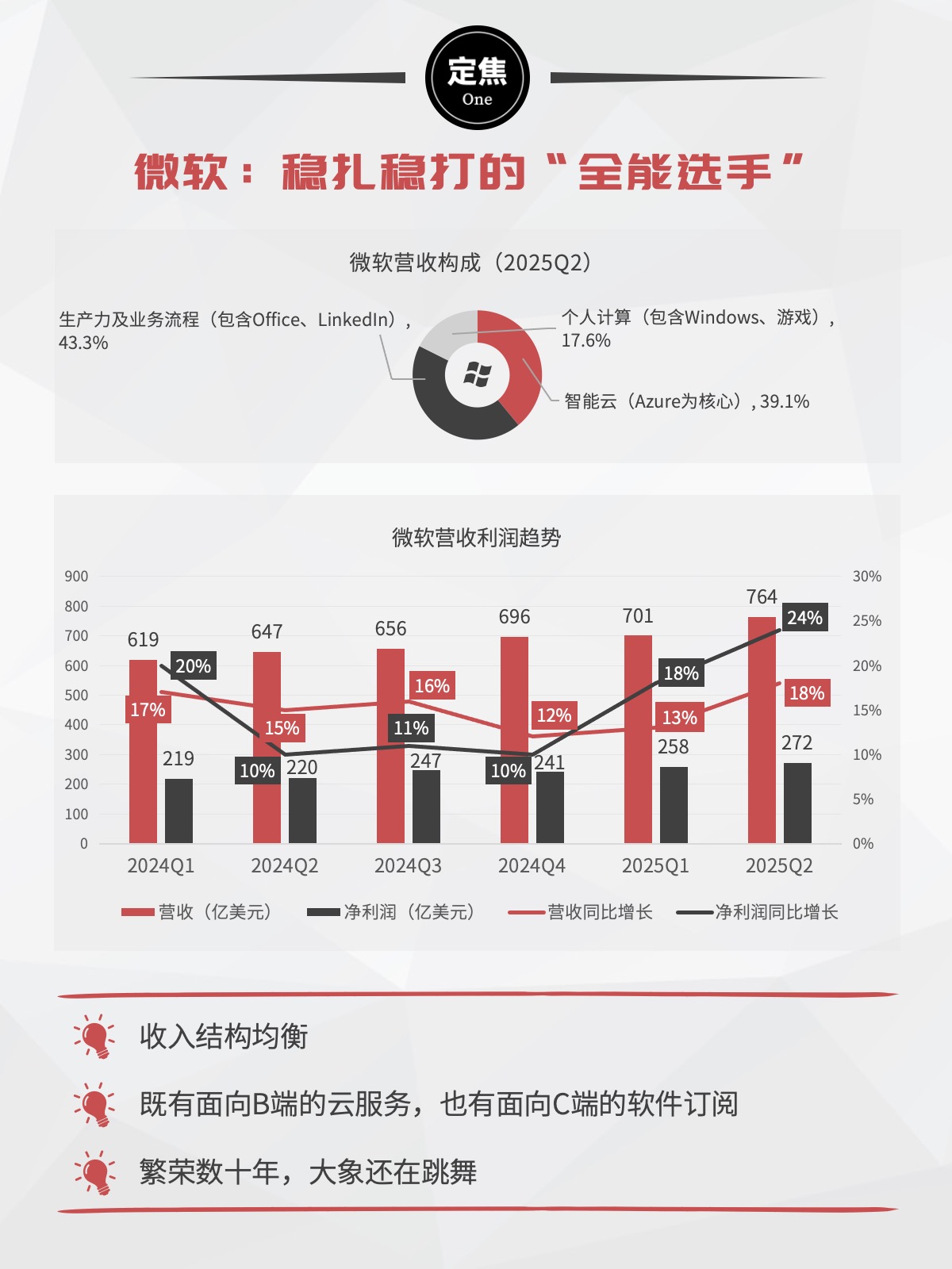 微软像是AI时代的整合者:有B端云服务,也有C端软件订阅。这季最大亮点是,因微软在Bing中加入了AI功能,搜索业务增长21%。