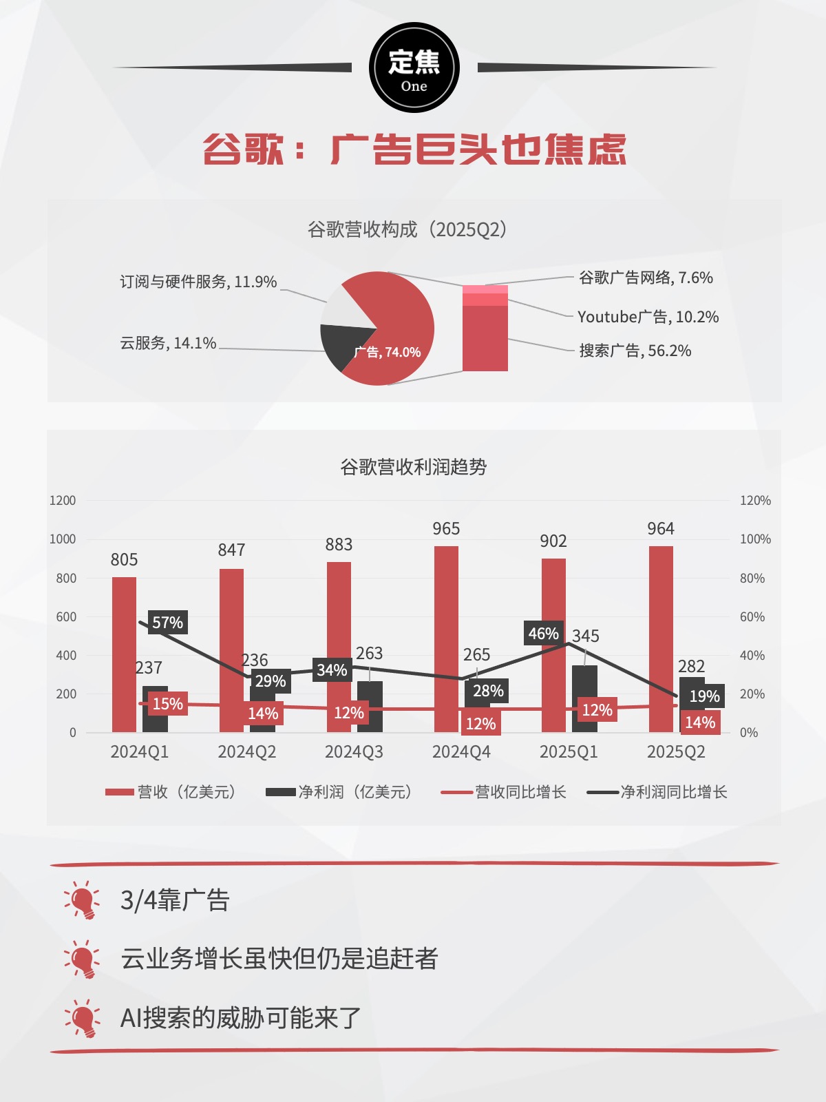 谷歌开始发力云业务,通过自研TPU芯片和AI解决方案吸引客户,这一季,收入增速超过AWS。但问题是,市场份额仍只有12%,谷歌要挑战AWS和微软还有很长的路要走。