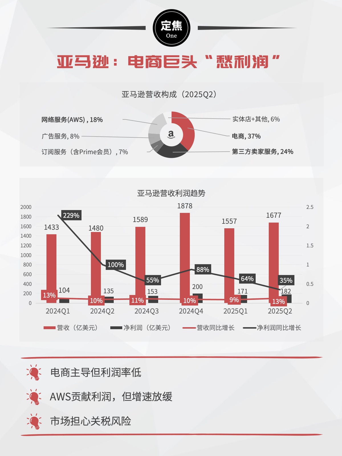 AWS云服务占比不到20%,贡献了大部分利润。但本季AWS营收仅增长17.5%,相比上季提速有限;这个本应高利润率的业务,经营利润也低于预期。当微软、谷歌在AI领域突破时,AWS还依赖传统的云服务模式。