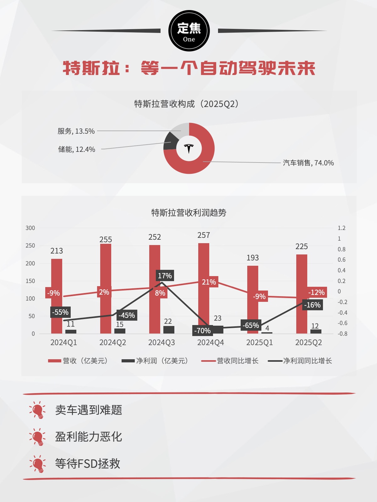 特斯拉的净利率排名垫底。马斯克布局很广,但公司主要靠卖车赚钱,而汽车制造是重资产行业。关键是,特斯拉的卖车收入已连续多个季度下滑;FSD今年上半年同比下降11%。