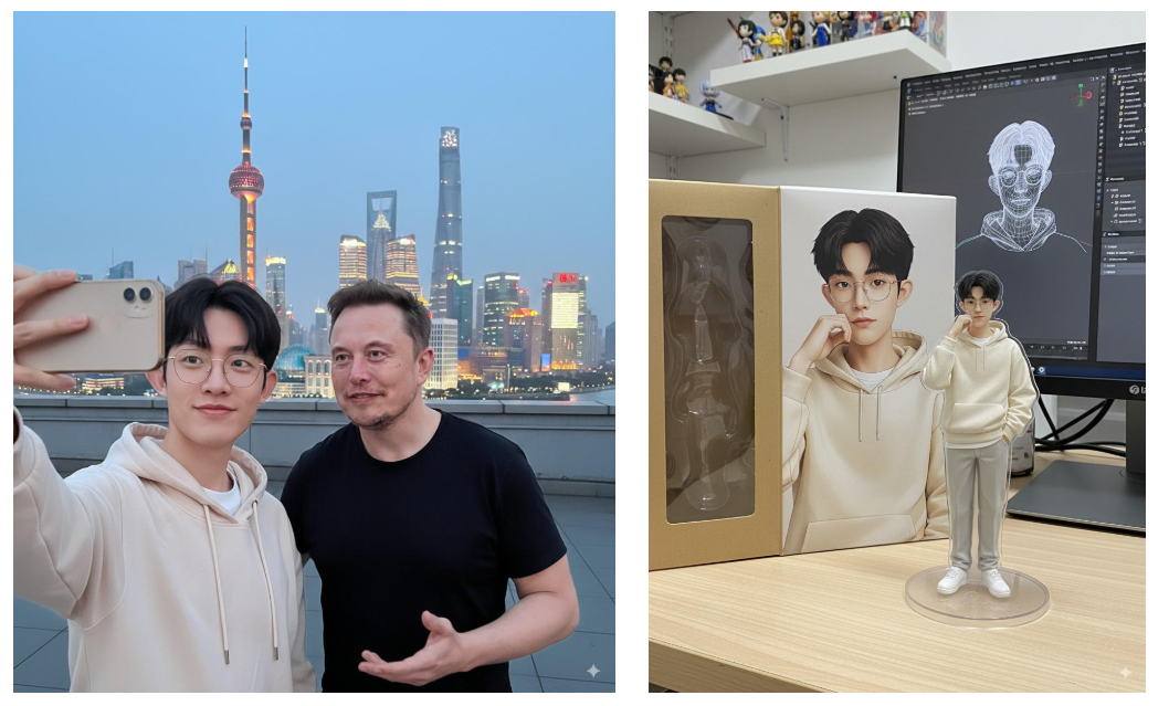 然后继续玩,再丢一张马斯克的照片进去,让我跟他合个影,背景还是上海滩,然后就出来了,人物我看着还蛮像的,要知道这相当于重新做一张图片了,还不是在原图修改下而已,所以能保持到这效果,目前真的只有banana能做到了。