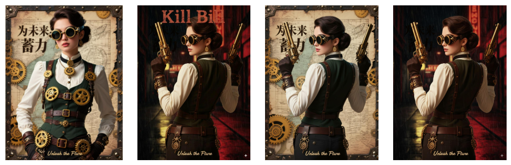 还有拿了一张概念图,从第一张图,让角色拿双枪,换视角,换整张图片的风格为杀死比尔风格,都做的非常好,无可挑剔。