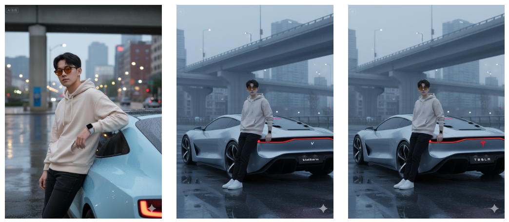不得不说,还是很酷的摆拍,再切换到远景视角,也没问题,甚至把汽车logo换了也没问题。