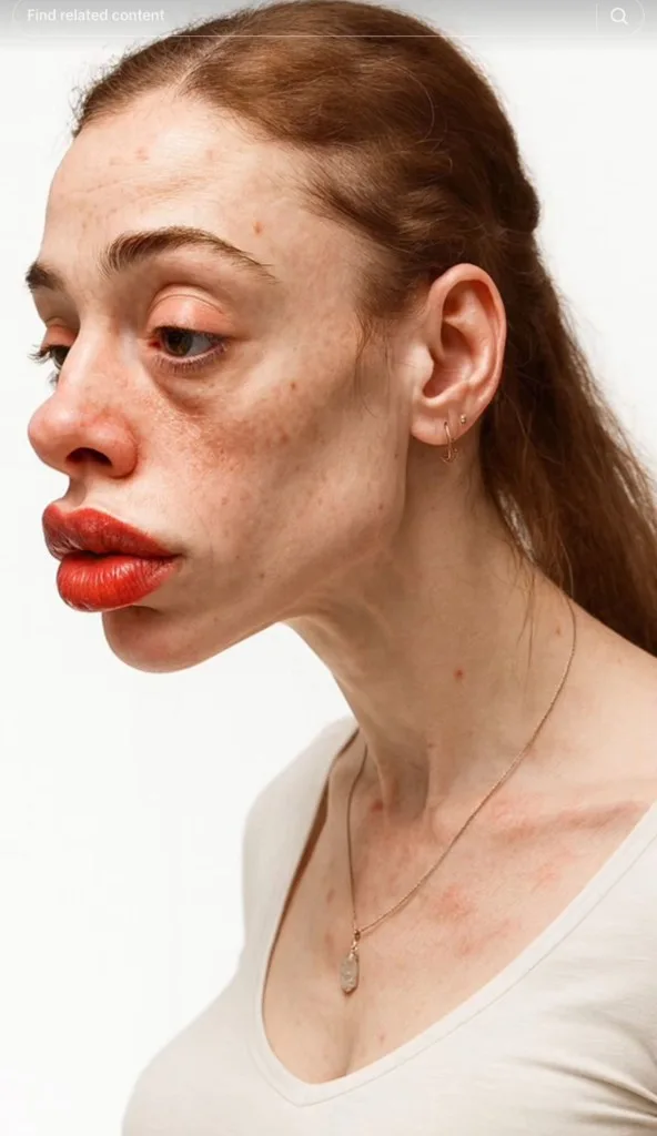 这是一个极其怪诞扭曲的模型——病态暴瘦、皮肤斑驳、驼背、脖子病态地向前伸。