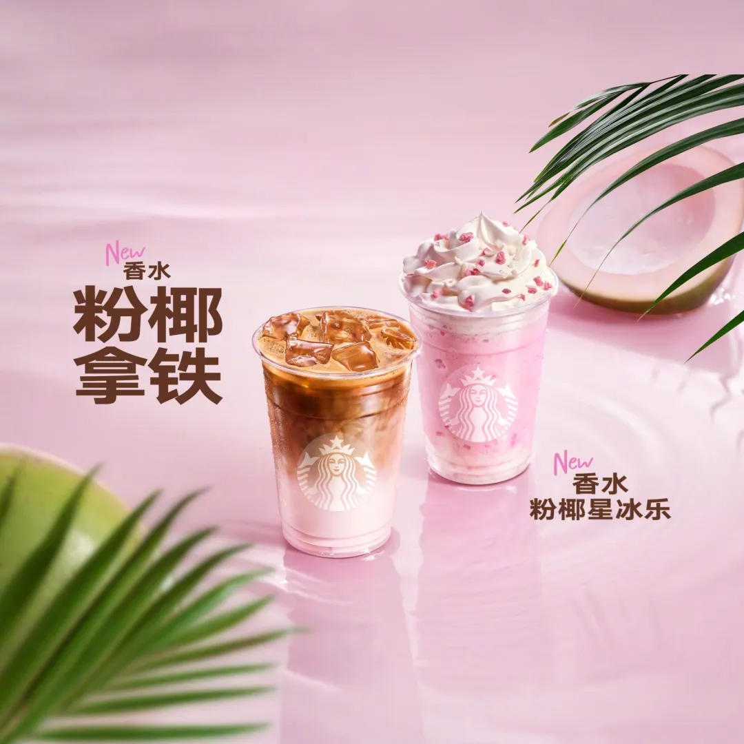 1、自然柔雾粉!星巴克借势七夕首发「香水粉椰拿铁」