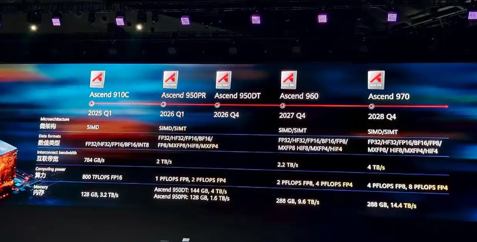 在全链接大会上,徐直军首次曝光了华为昇腾芯片的完整演进路线。未来三年,华为将推出三大系列芯片,包括Ascend 950(含PR和DT两型号)、Ascend 960和Ascend 970。
