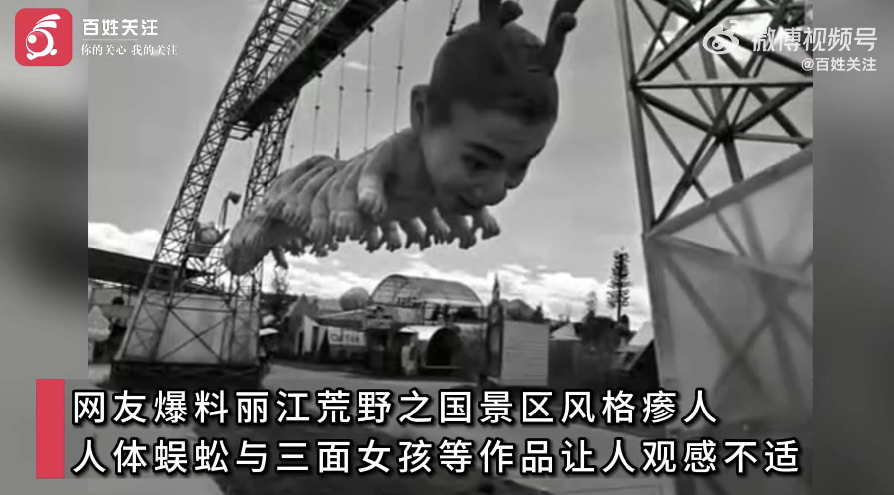 10月11日,有网友发视频称云南丽江荒野之国景区画风诡异,风格偏日系风,而人体蜈蚣与三面女孩等作品让人观感不适。