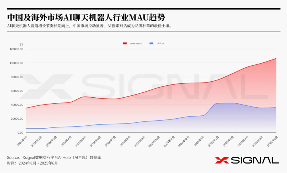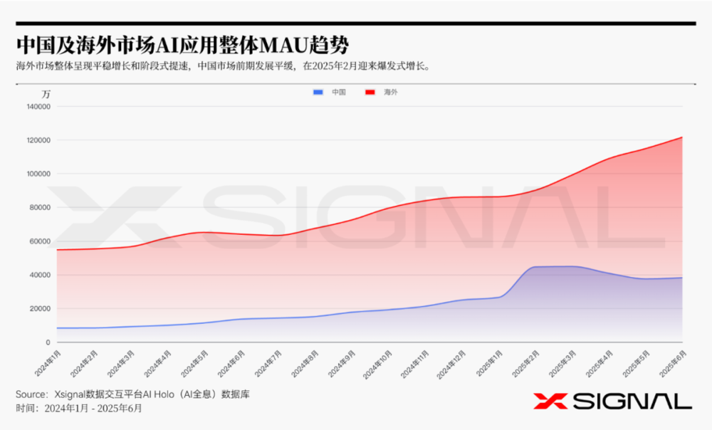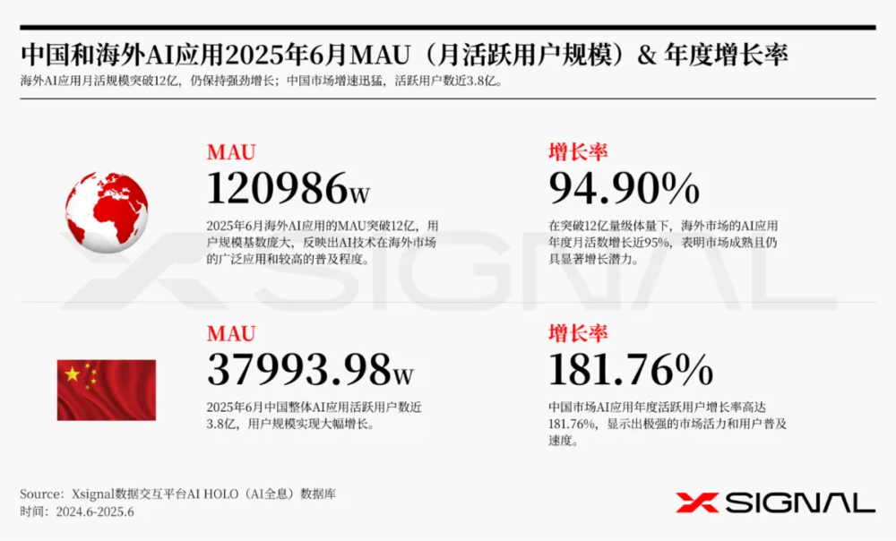 截至2025年6月,海外AI应用月活跃用户(MAU)已突破12亿,同比增长94.9%,表明海外市场仍处于高速扩张区间。