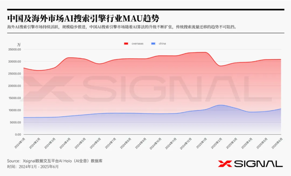 中国市场:2024年1月至2025年6月,AI搜索应用月活由6929万提升至1.05亿,增幅超50%。增长主要得益于夸克、纳米AI搜索等产品在AI算法优化和多模态交互(如语音、图片搜索)方面的创新,这些创新显著提升了用户粘性。