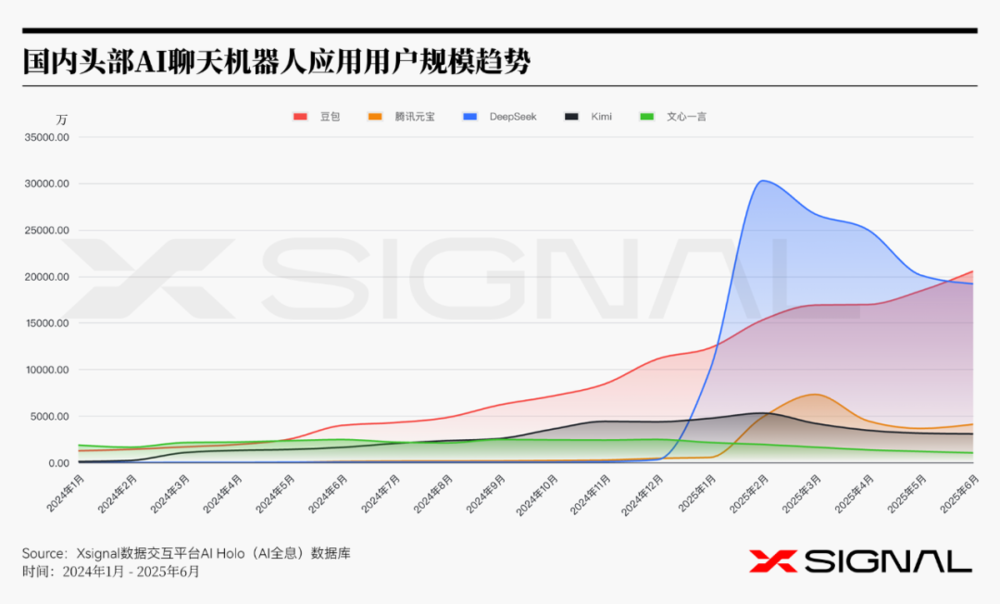 DeepSeek凭借“出生自带”的技术民主化路径和深度思考模式,一经推出便引发了国内的广泛关注,2025年第一季度的用户增速达到同期行业均值的20倍,用户规模遥遥领先。随后在热度消退和同质化应用增多的情况下,自4月起稍有回落,进入盘整期。