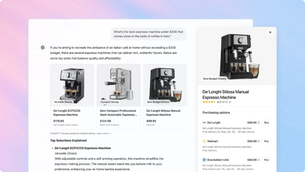 购物更加依赖AI搜索:根据贝恩公司的调研,约80%的用户至少在40%的搜索中依赖AI生成的结果。其中,42%的用户使用AI搜索获取购物推荐,成为最主要的应用场景之一。AI搜索正逐步接入电商:正如下图示例,当用户在对话中提问“意式咖啡机推荐”时,Chatgpt可以直接展示带图商品以及价格等参数,并附带电商平台的跳转链接。AI搜索正从信息中介,转型为交易引导者和新入口。