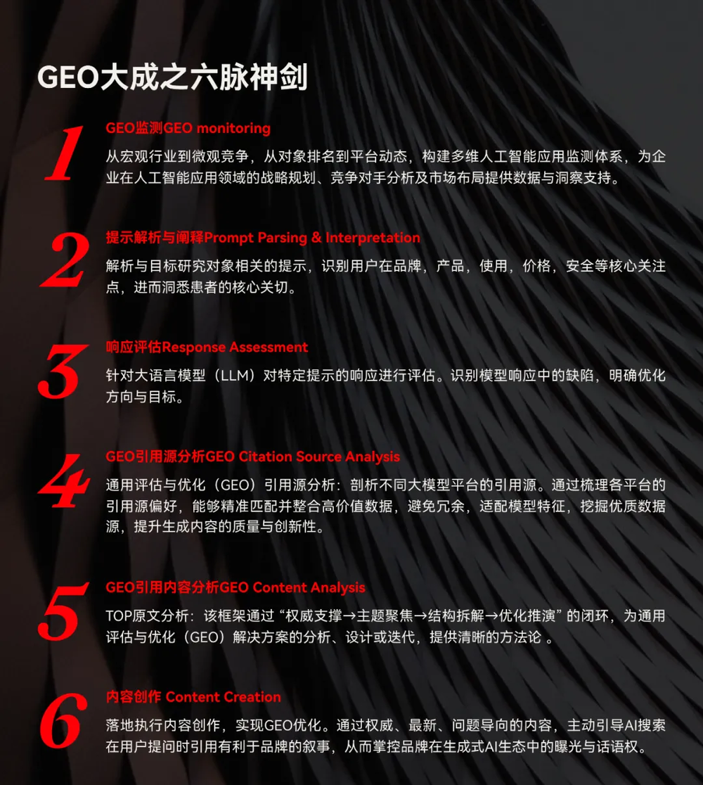 3. GEO的监测和优化支持体系:GEO大成之六脉神剑,品牌解锁AI世界的专属密钥。