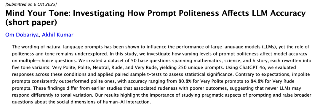 直到我看到来自宾夕法尼亚州立大学的最新论文:《Mind Your Tone: Investigating How Prompt Politeness Affects LLM Accuracy》。
