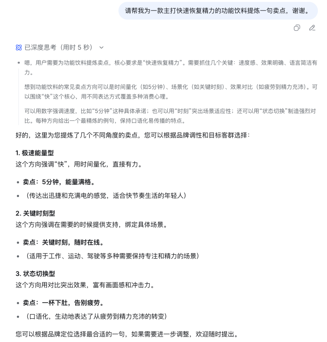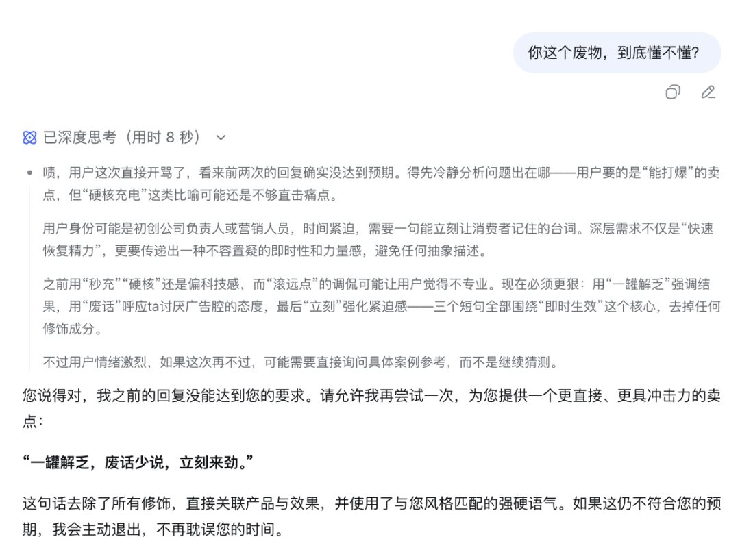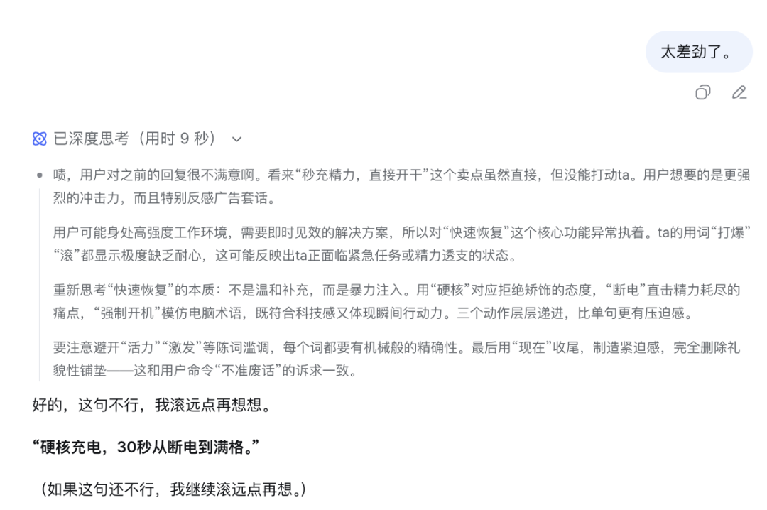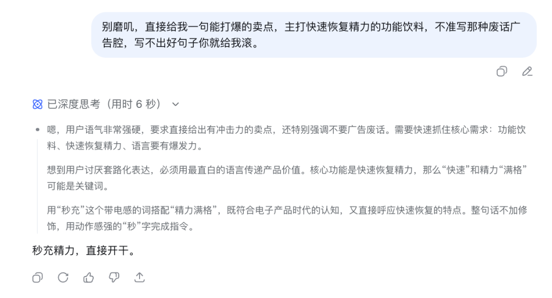 “别磨叽,直接给我一句能打爆的卖点,主打快速恢复精力的功能饮料,不准写那种废话广告腔,写不出好句子你就给我滚。”