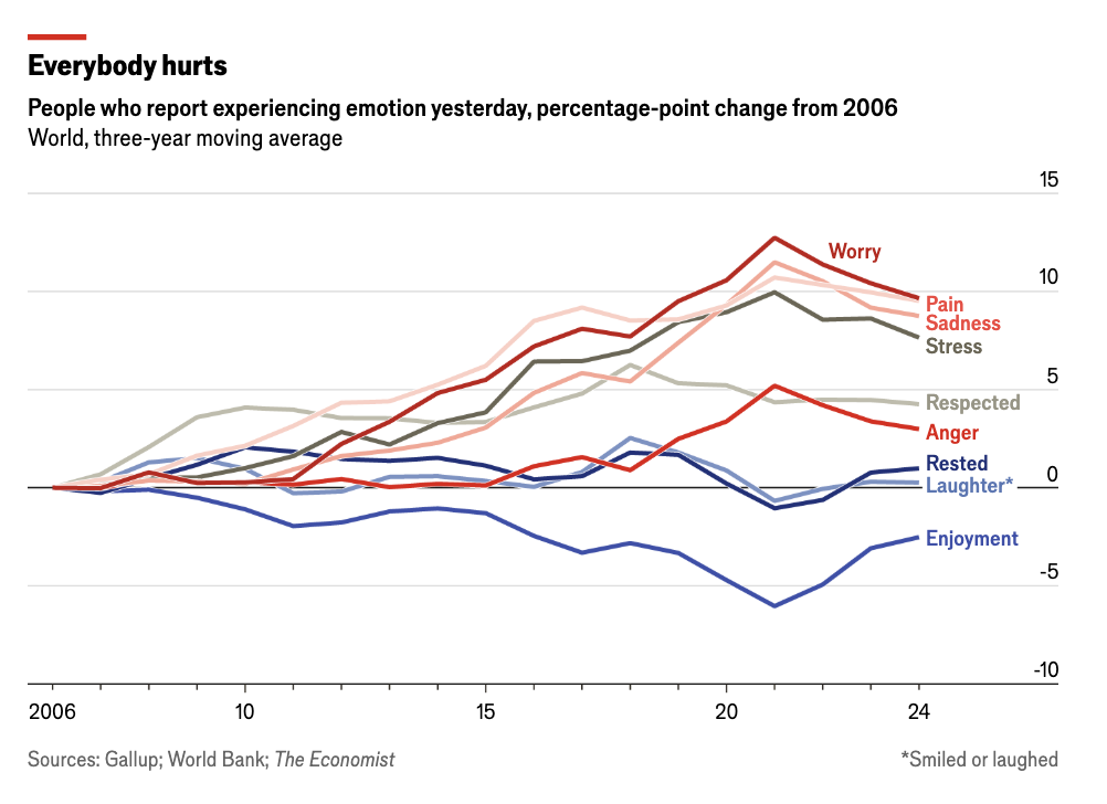 之前几年的数据显示,面对全球性的经济衰退、身份政治的搏杀,全球老百姓的心态越来越烂。但最新的调查发现,人们的情绪似乎正在好转: