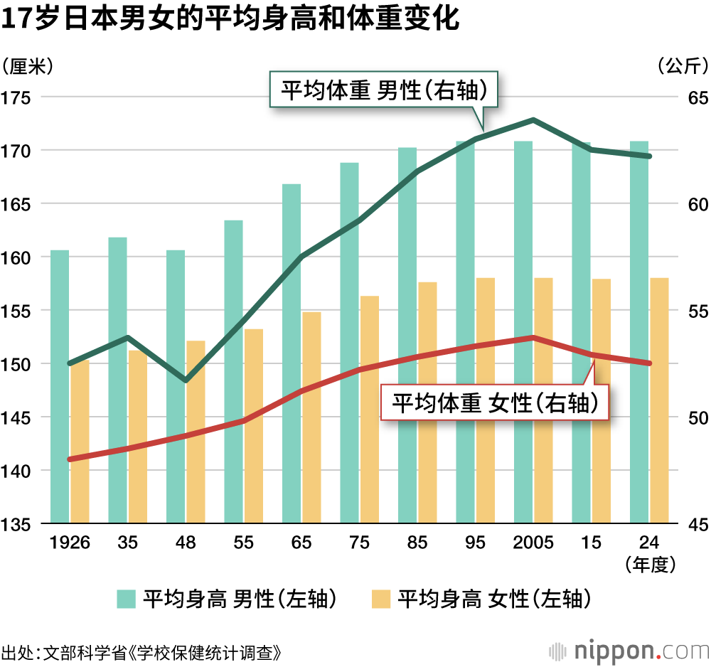 资料显示,1900年日本17岁男性的平均身高和体重分别为157.9厘米和50.0公斤,女性分别为147.0厘米和47.0公斤。