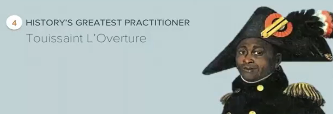 conquering the enemy(战胜敌人),作为奴隶的他是如何塑造管理文化的?他的队伍以从不烧杀抢掠闻名,他甚至将战败军队中的将领收编入自己的团队。特别是将法国军队收编,他们非常震惊并没有被杀死。Ben引述杜桑非常机智,他的主人曾经让他在图书馆里学习,希望他能最终运营种植园。而他在图书馆中向凯撒学了这招从而收编了法国军队。