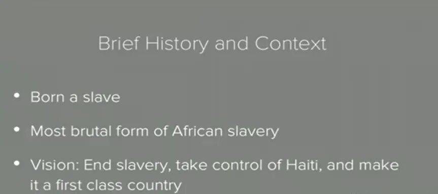 杜桑作为海地奴隶制革命领袖,他的远景有三个关键词:End Slavery结束奴隶制度、接管海地以及使之成为一流的国家。那么他又是如何做的呢?
