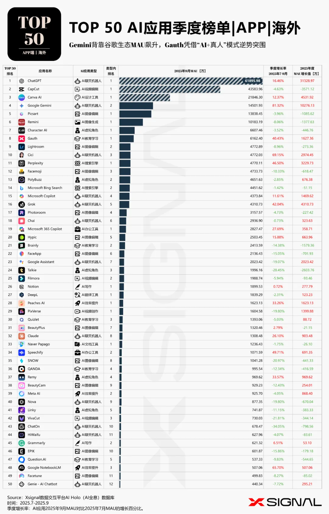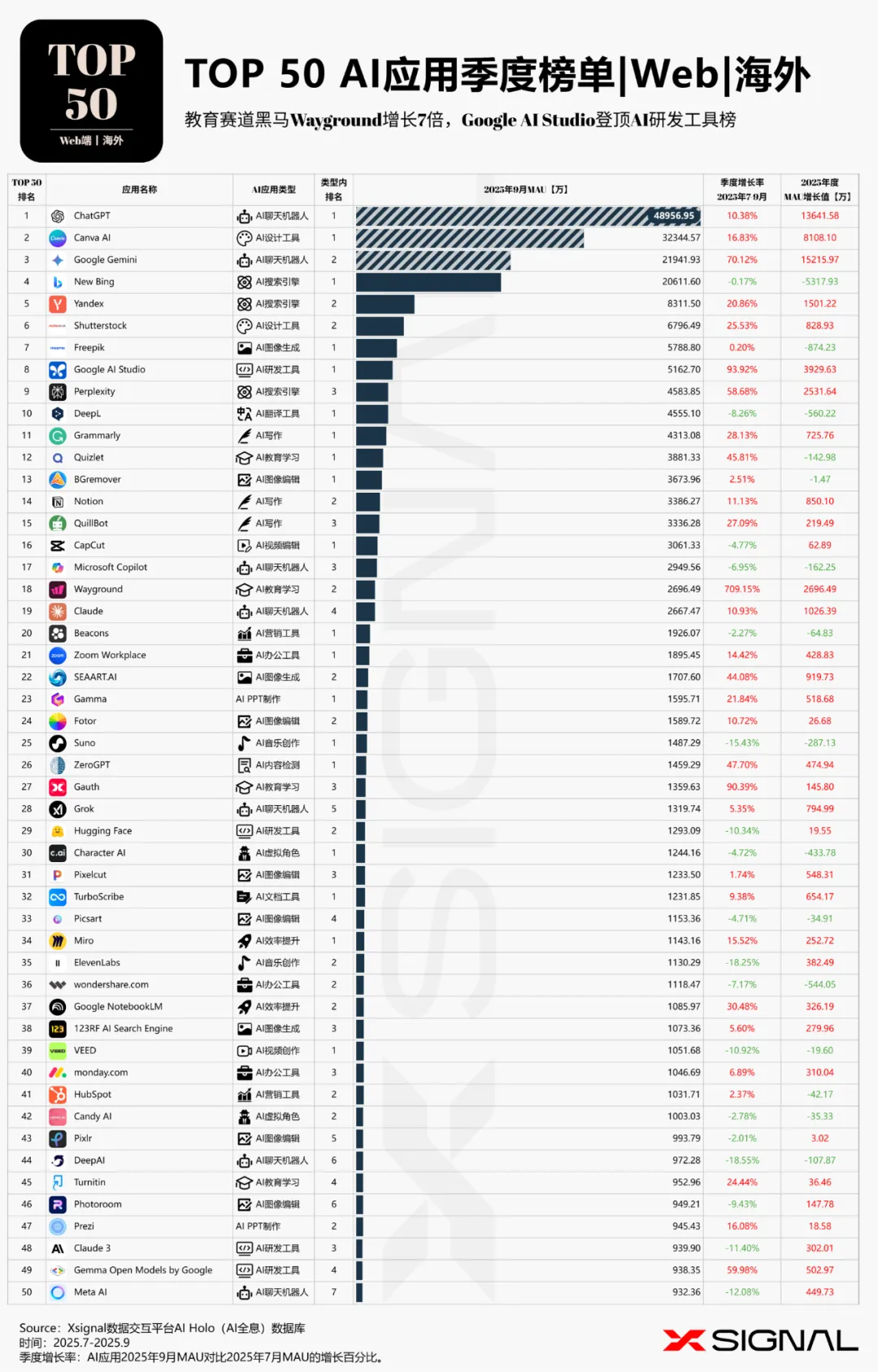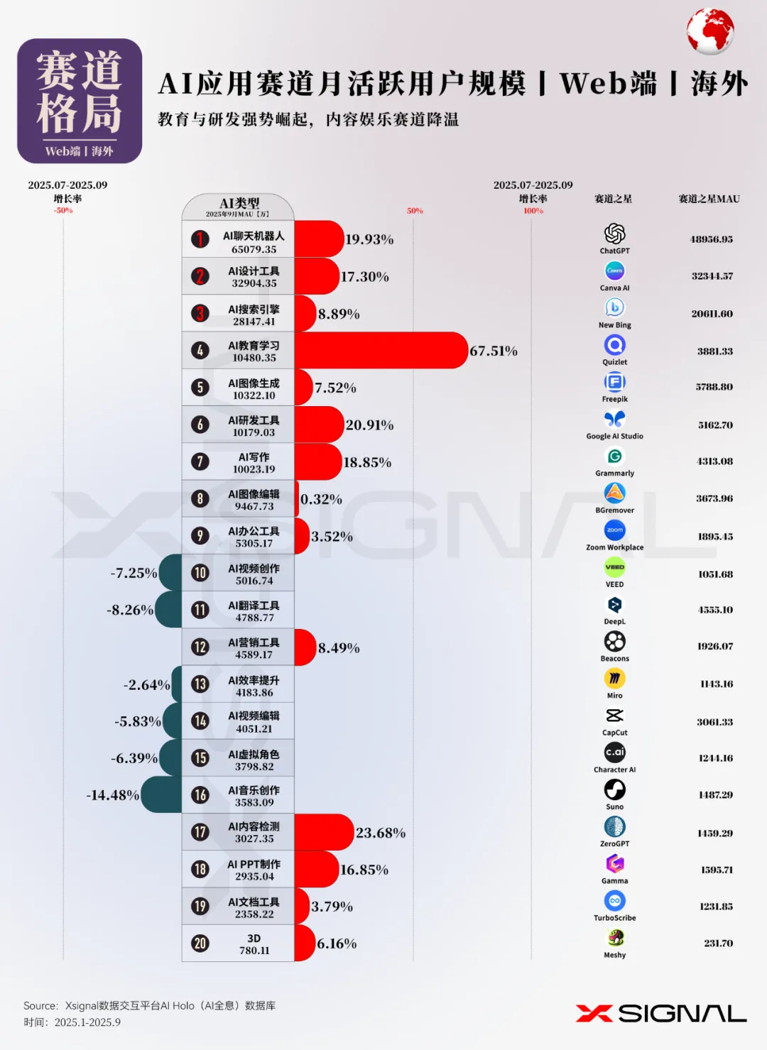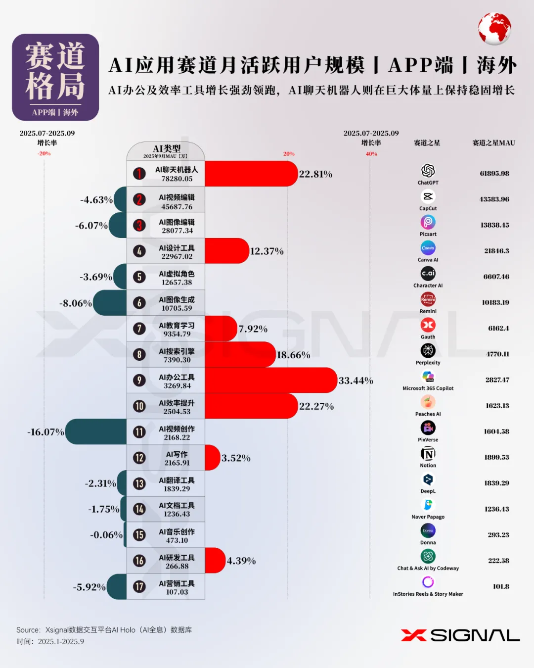 本次,X博士继续应用Xsignal数据交互平台的AI Holo(AI 全息)数据库数据,为你提供海外AI应用市场2025年9月的最新发展动态,发布2025年9月海外“赛道格局”、“赛道之王”、“TOP 50 AI应用”和“增长之星”四大数据榜单及深度洞察。