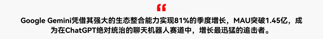 在生态整合上,Gemini增长的核心引擎是取代Google Assistant,并深度绑定谷歌搜索、Gmail等庞大产品矩阵,将数十亿存量用户直接转化为增长基本盘。2025年以来,谷歌通过系统级预装和集成,将其定位为下一代个人AI助理,极大推动了其MAU的爆发式增长。