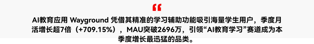 AI聊天机器人(9月MAU 6.51亿)霸主地位稳固,Q3增长达19.93%,而AI音乐、视频等成熟内容赛道普遍下滑。市场增长新引擎转向生产力与垂直领域,AI研发工具(年增91.91%)和AI文档(年增41.01%)成为核心动力。最显著的是,AI教育学习赛道在年中下行后,Q3迎来67.51%的爆炸性反弹(MAU达1.05亿),释放出强劲复苏信号。
