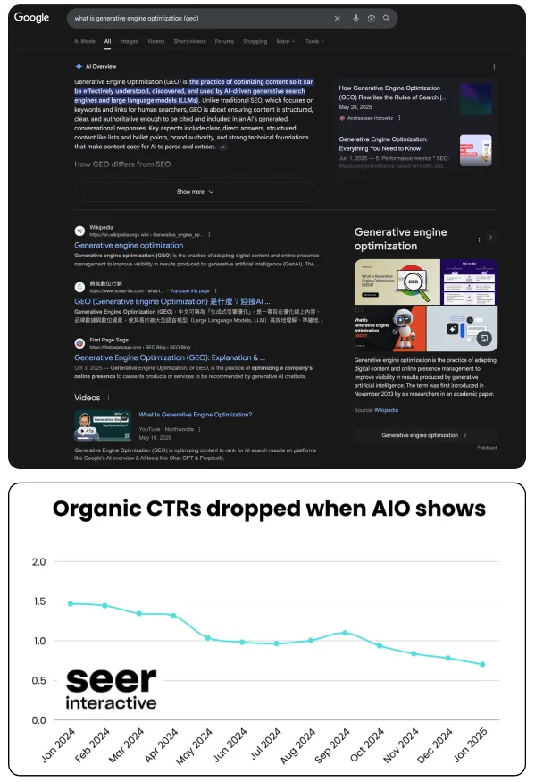 在AI生成结果直接呈现答案的情况下,用户越来越少点击传统搜索结果或广告,而是倾向于从AI生成内容中直接获取信息。这种变化对企业的 自然流量(Organic CTR) 和 付费流量(Paid CTR) 造成了深远影响。