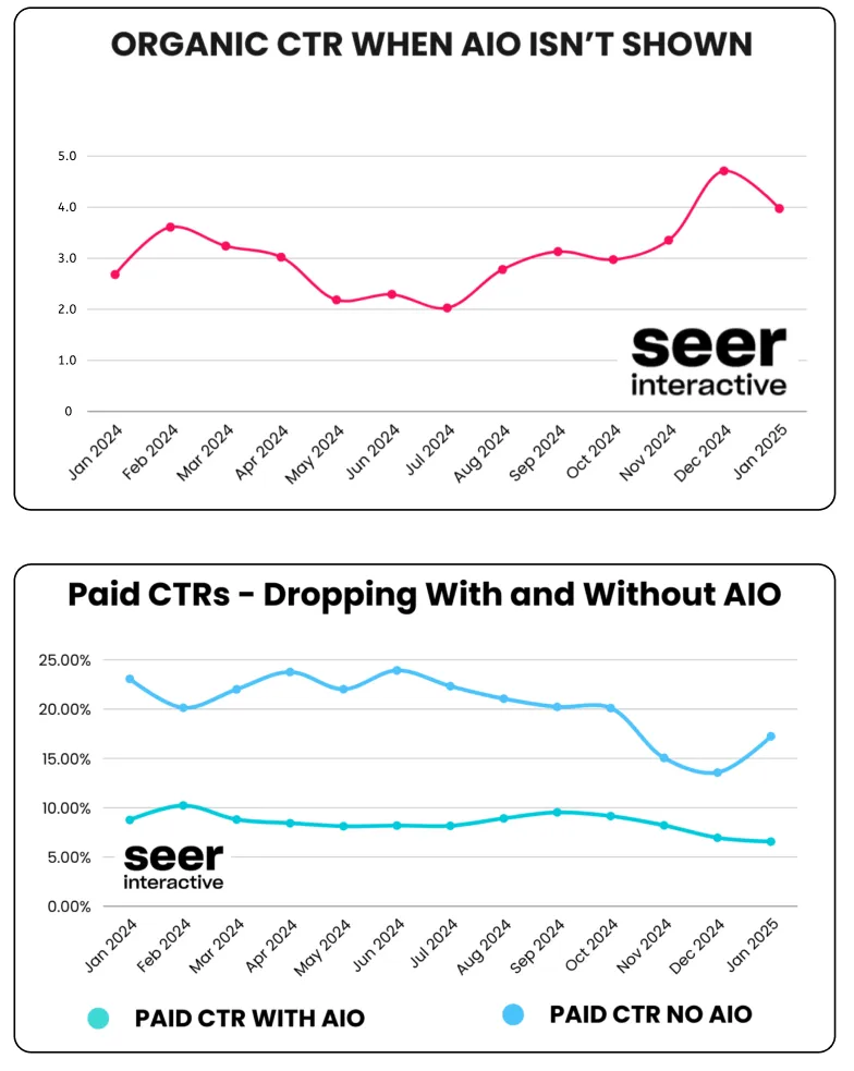 在付费广告领域,CTR 同样出现显著下降。无论是否出现 AIO,付费点击率均呈现持续下滑趋势:从 2023 年初约 20–25% 降至 2025 年初不足 10%。