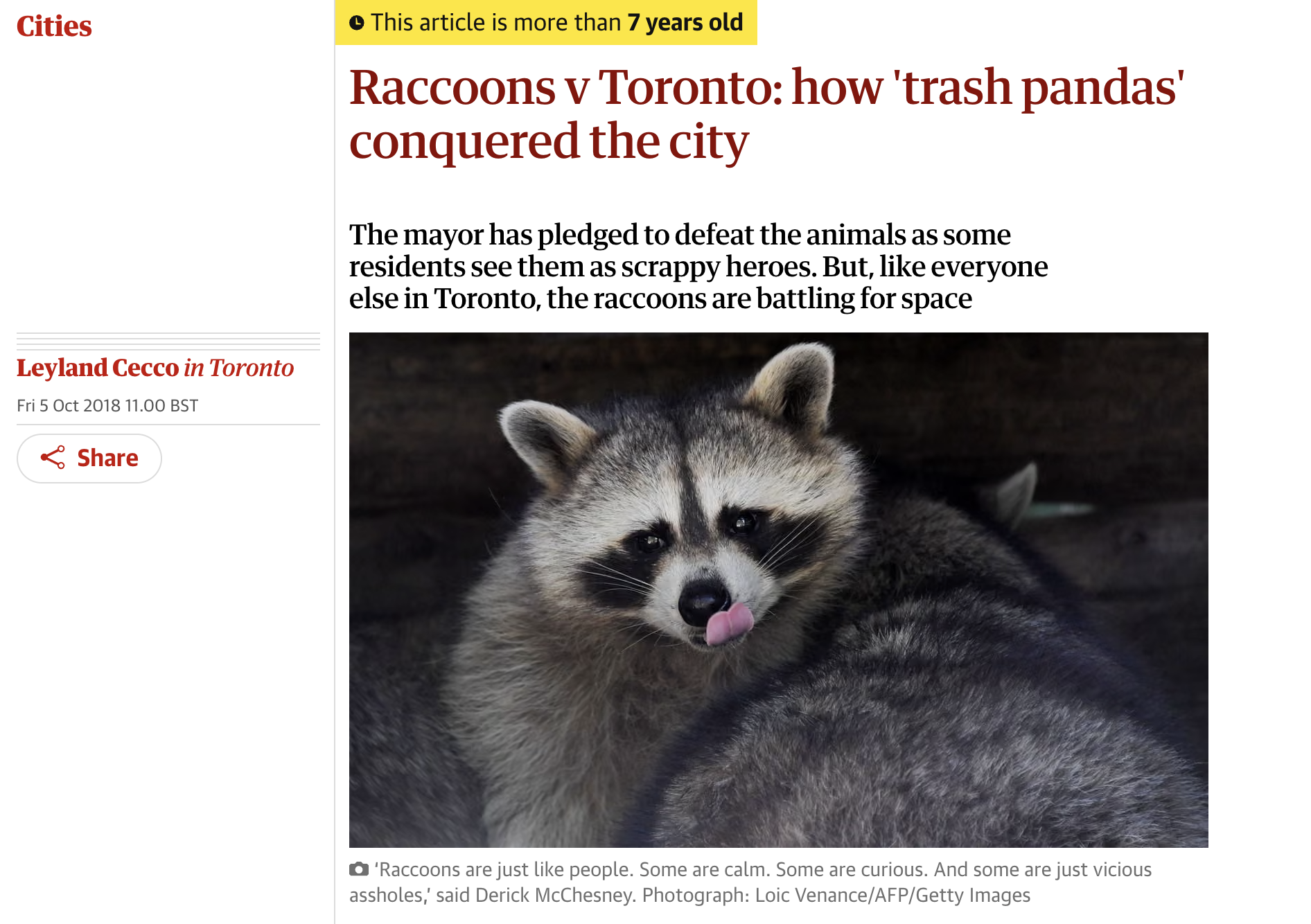 因此,不挑食的浣熊在某些地方早已泛滥。在加拿大多伦多,它们的数量已经多到令人难以置信。这甚至都变成了当地的一个流行口号:“浣熊VS多伦多”。