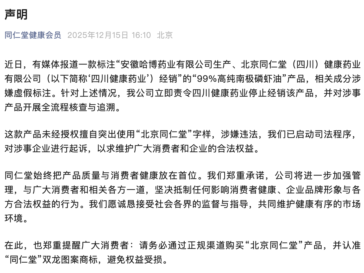 12月15日,“同仁堂健康会员”微信公众号发布声明称,有媒体报道一款标注“安徽哈博药业有限公司生产、北京同仁堂(四川)健康药业有限公司(以下简称‘四川健康药业’)经销”的“99%高纯南极磷虾油”产品,相关成分涉嫌虚假标注。