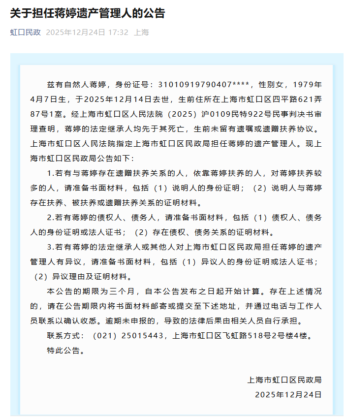 据每日经济新闻,近日,上海虹口区46岁独居女子蒋女士离世,其遗产处置问题引发关注。12月24日,上海市虹口区民政局发布《关于担任蒋婷遗产管理人的公告》: