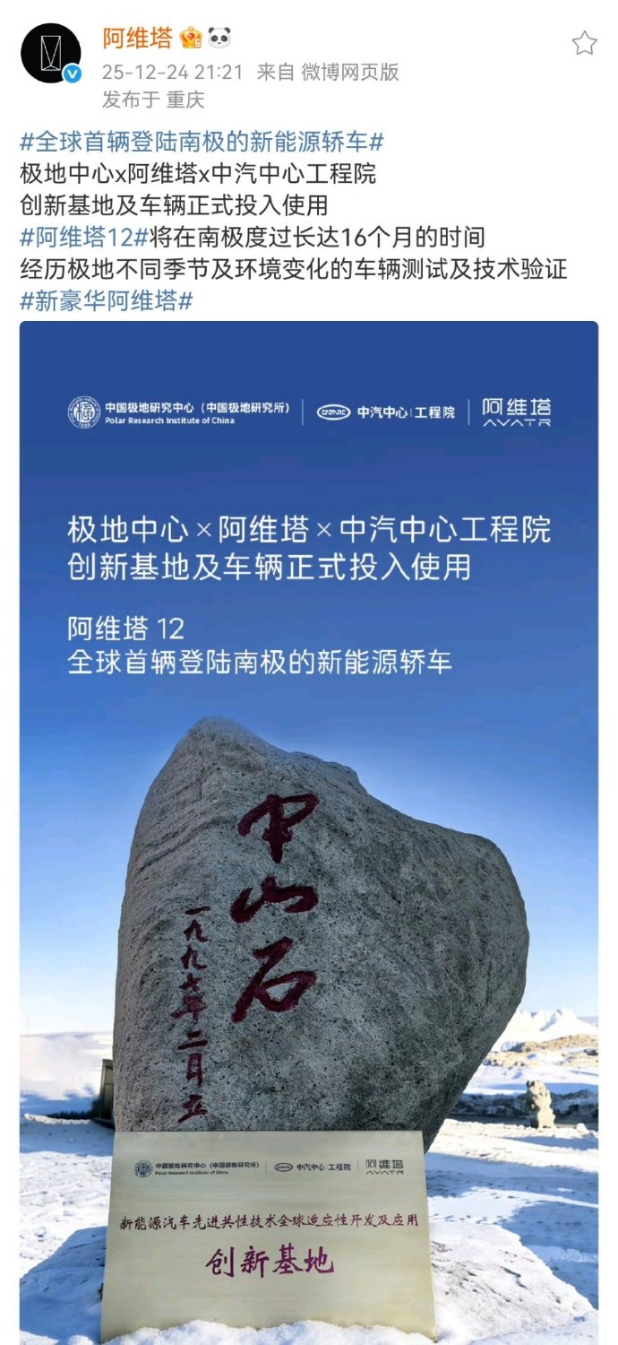 12月8日,阿维塔宣布,作为全球首辆登陆南极的新能源轿车,阿维塔12已抵达南极正式开启科考之旅。网友质疑,阿维塔12抵达南极时正值南半球夏季(12月),中山站实测气温仅约-1℃,同期北京为-6℃,宣传与实际温差达50℃。气象平台数据显示,中山站夏季最低温罕见低于-10℃,极寒测试条件不成立。