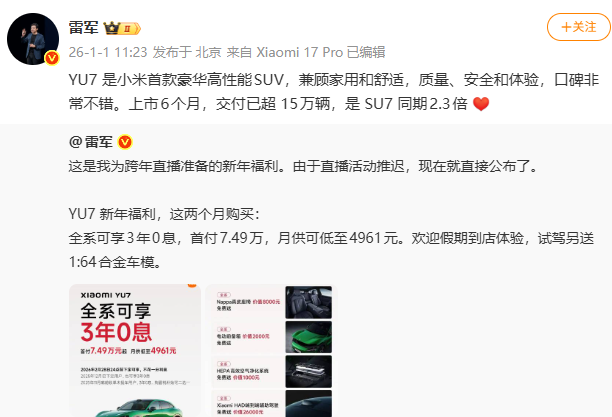 2026年1月1日,雷军宣布小米YU7上市6个月交付已超15万辆,是SU7同期的2.3倍。YU7是小米首款豪华高性能SUV,兼顾家用与舒适,口碑良好。自2025年7月交付,销量逐月攀升,助力小米汽车2025年交付超35万辆。新年还推出YU7购车福利。