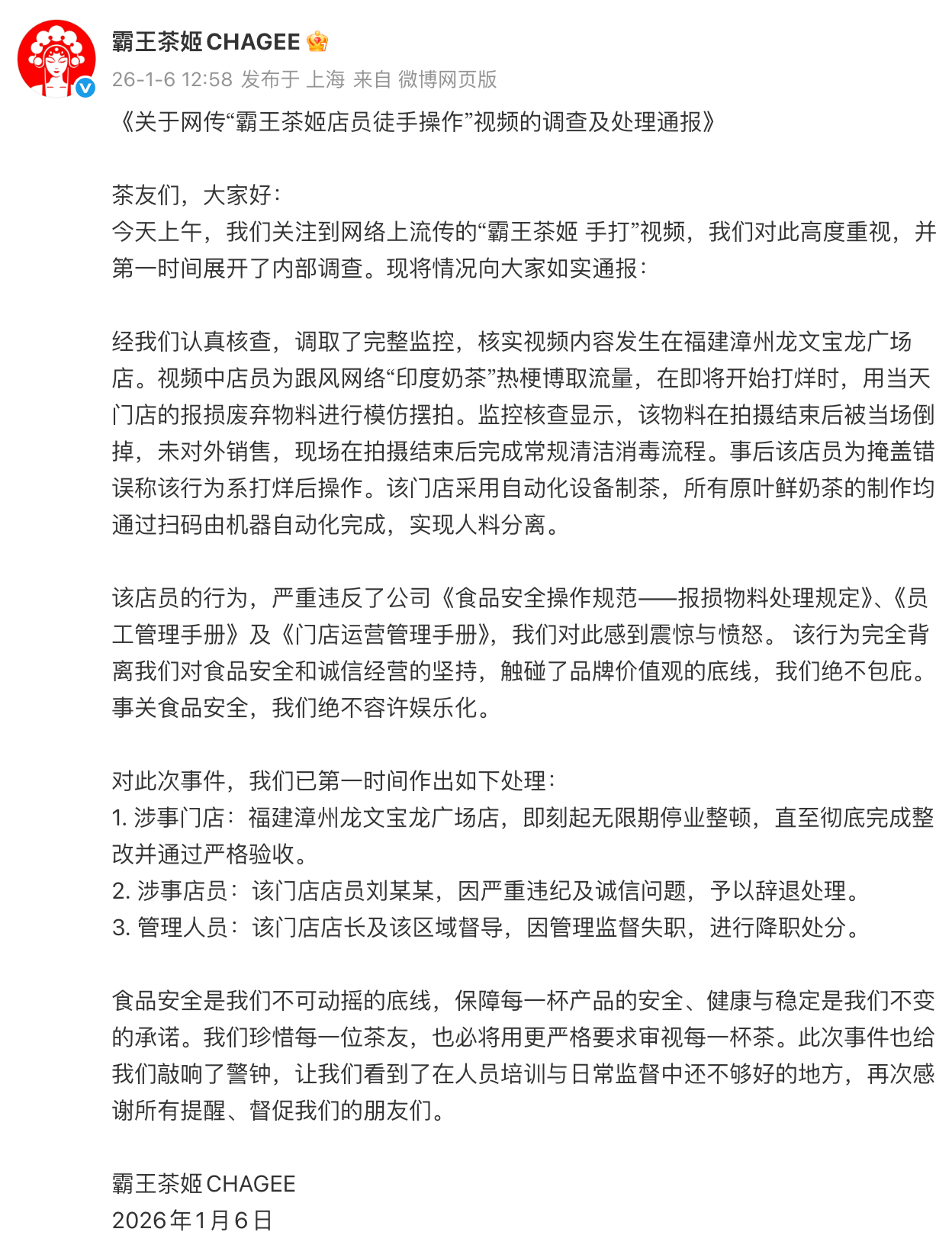 2026年1月6日,霸王茶姬针对网传“店员徒手操作”视频发布调查通报。