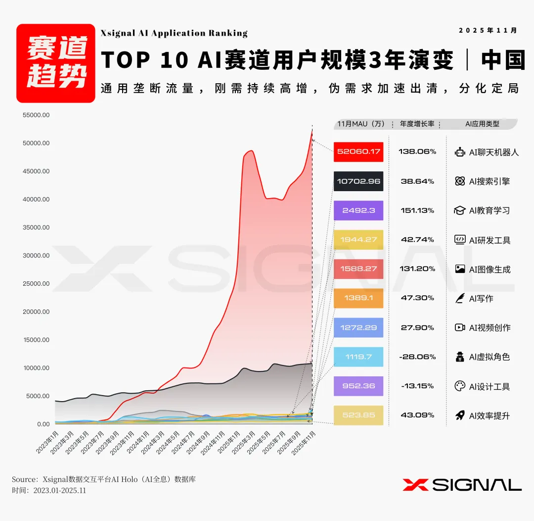 2023-2025 这三年,全球 AI 应用市场完成了从“单点工具猎奇”向“双极化生态定局”的结构性跨越。Xsignal AI Holo(AI 全息)数据库向我们揭示了一个冷峻的真相:通用平台凭借“超级入口”地位确立了绝对的流量垄断与降维吞噬,而垂直赛道唯有通过“去插件化”并深植于核心生产力工作流,方能在智能体(Agent)时代构建起真实的生存护城河。