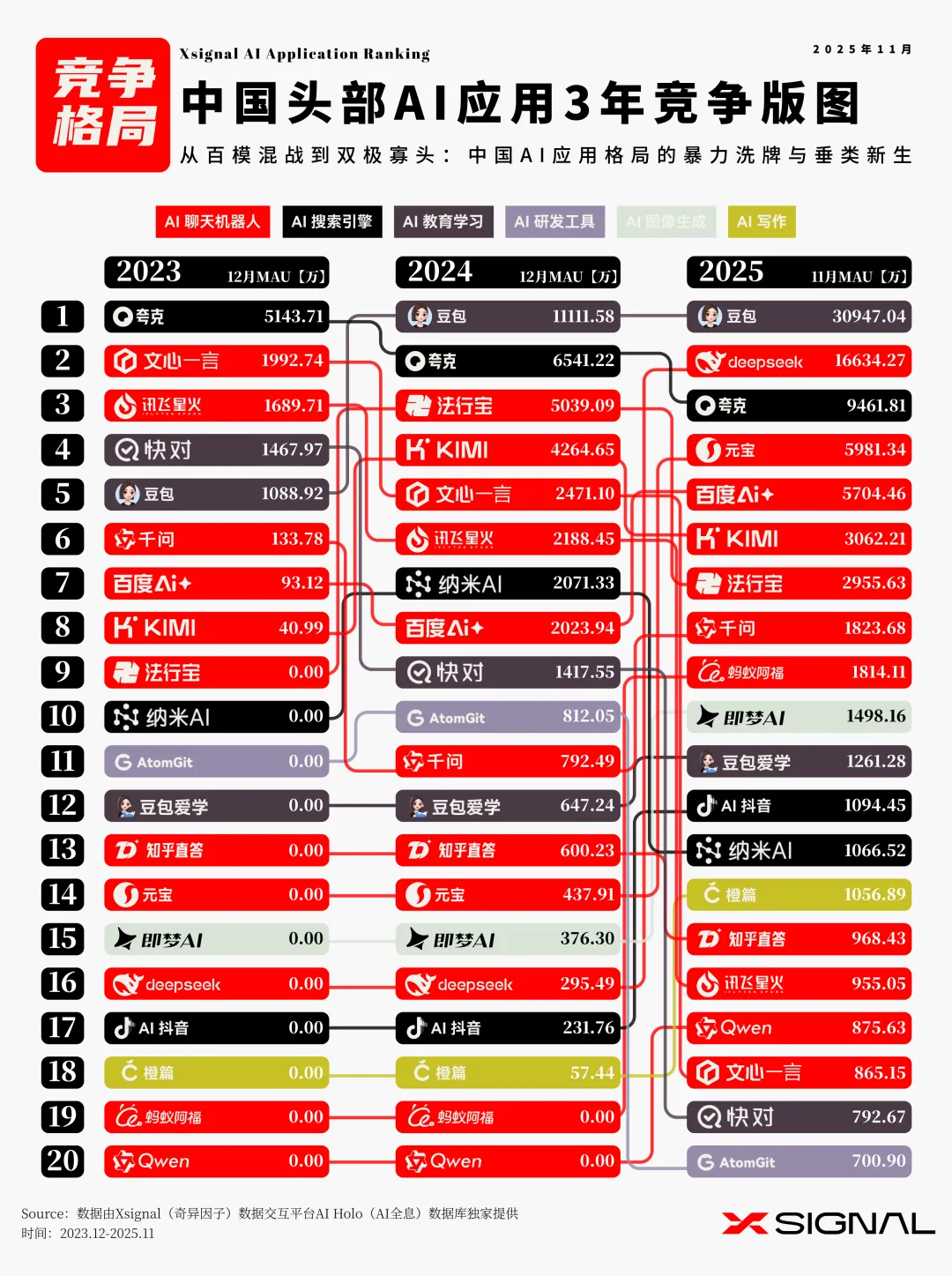 · 豆包的跃升:从 2023 年的 1000 万级跃升至 1.1 亿级,确立了头部地位。