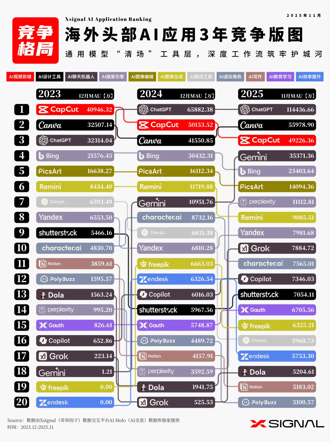 · 胜出者:拥有底层大模型能力的超级平台(OpenAI、Google)以及深刻嵌入特定场景的生态型工具(Canva、Grok)。