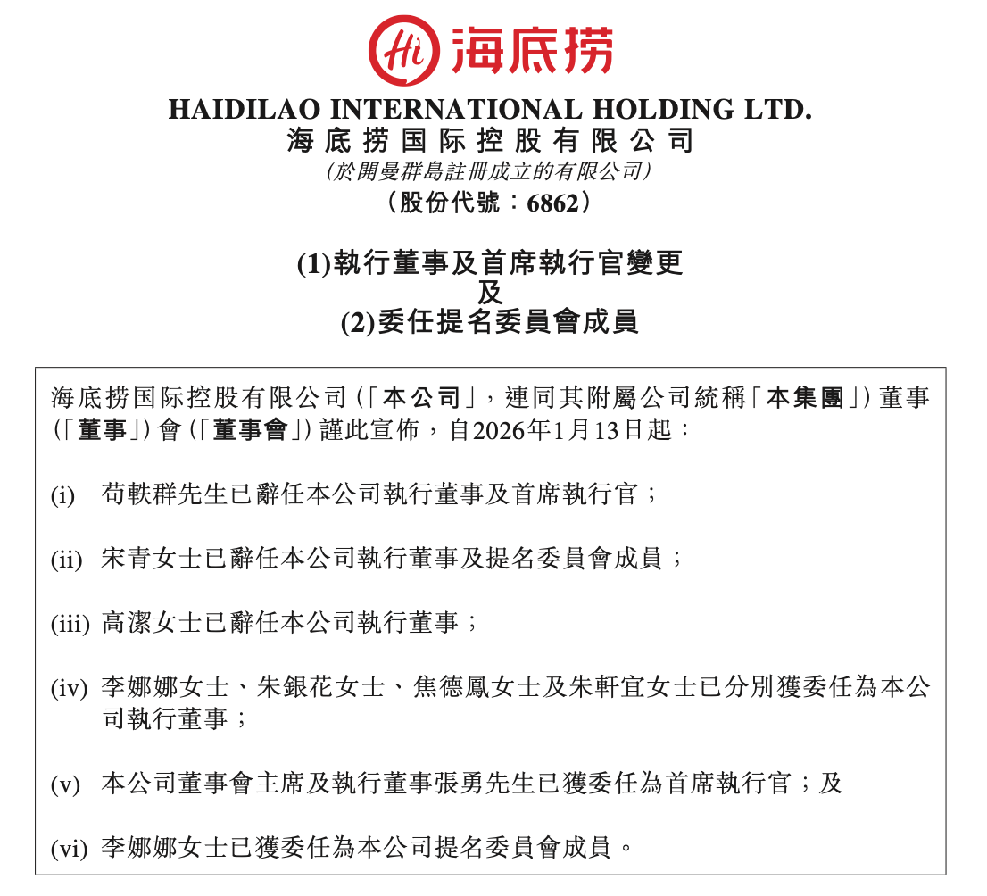 1月13日,海底捞在港交所公告,苟轶群已辞任公司执行董事及首席执行官,基于对公司管理层安排的整体调整及综合考察,董事会主席兼执行董事张勇已获委任为公司首席执行官,自2026年1月13日起生效。