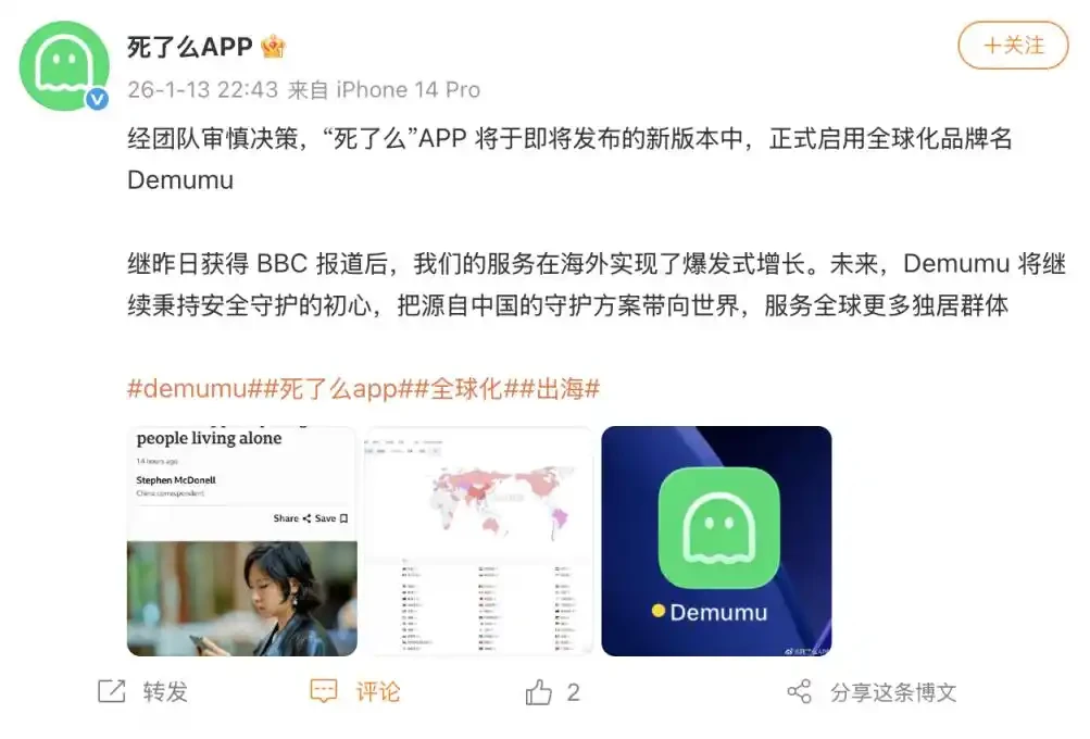 “死了么app”官方微博1月13日晚发文称:经团队审慎决策,“死了么”APP 将于即将发布的新版本中,正式启用全球化品牌名 Demumu。