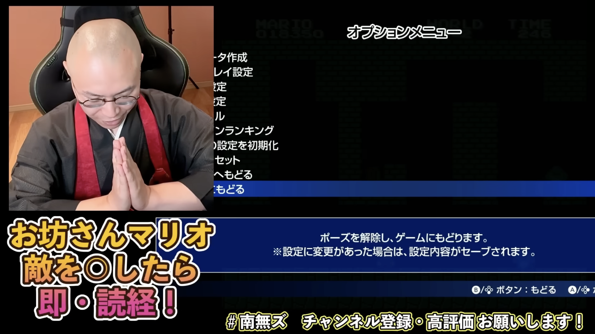 而每当他不小心杀死一个敌人(比如库巴、栗宝宝和其他生物)的时候都必须立马暂停游戏,然后诵读一段经文,以求死者安息。