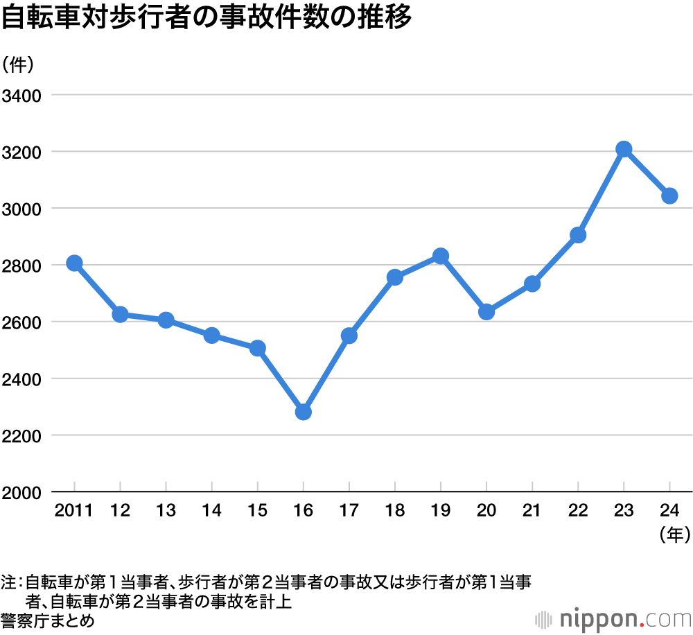 按日本警察厅公布的说法,由于整体交通事故的下降,自行车事故的占比正在不断攀升,2024年占比达到了23.2%,其中75%的案例是骑行方过错。