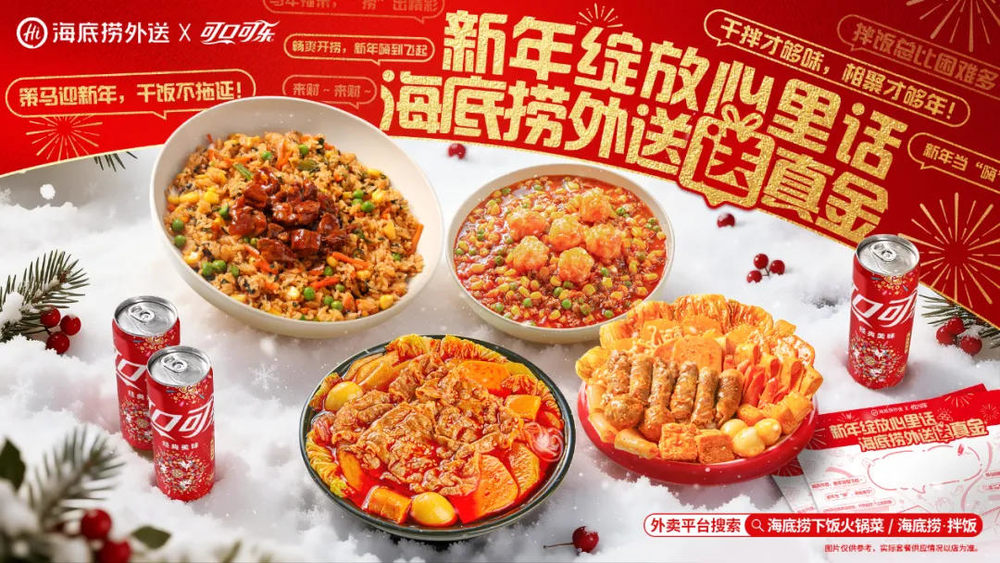 近日,海底捞与可口可乐联手,在外卖场景开展“新年绽放心里话”联名营销,基于双方王牌产品推出三款【畅爽捞金】联名套餐,分别为捞派肥牛冒菜套餐、捞派肥牛干拌麻辣烫套餐以及武汉黑鸭风味烤牛肉粒拌饭套餐,每份套餐搭配可口可乐1听。除套餐上新外,双方还结合外送消费场景链路,发起互动活动,消费者可通过扫码参与“捞金”抽奖,也可在社交媒体分享“新年心里话”与品牌深度互动。
