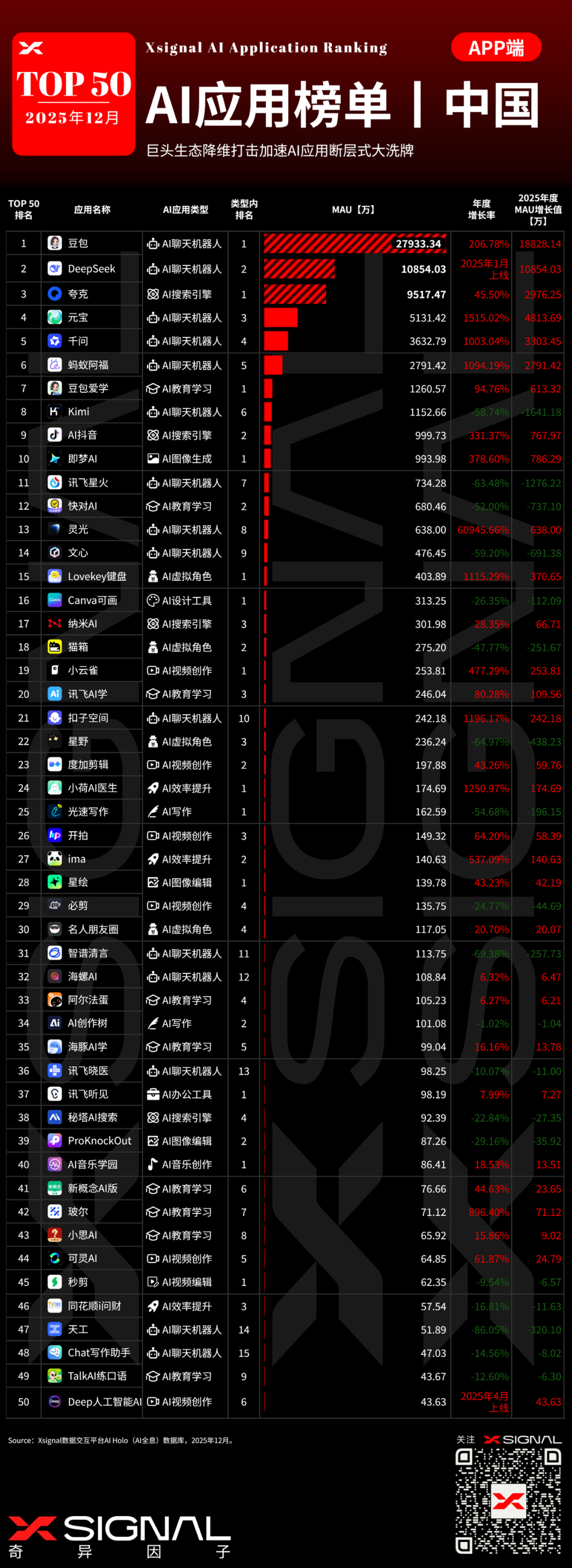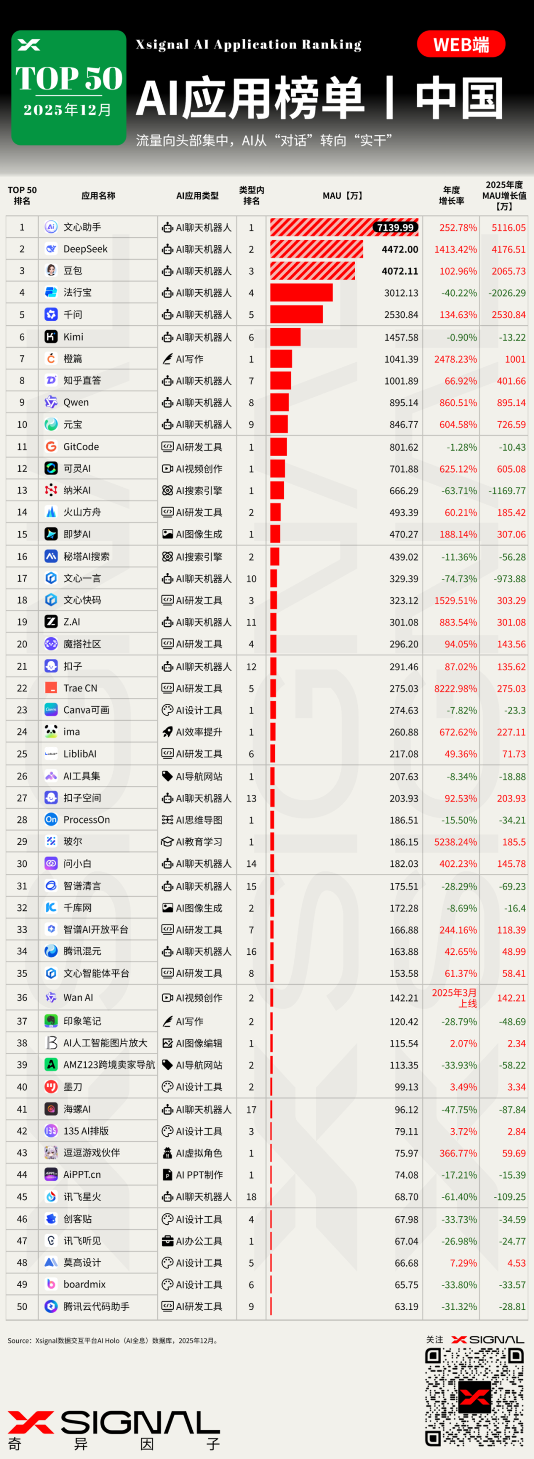 DeepSeek(深度求索):MAU 4472万,年度最强黑马。作为独立厂商,以1413%的增速硬刚互联网巨头,证明了“模型能力即产品力”。