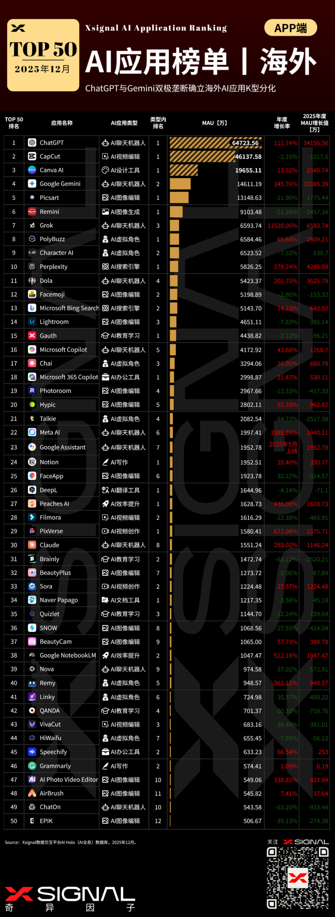 数据洞察: Sora (#32) 尽管上线时间短(2024年12月数据),已斩获1365万MAU;CapCut (#11) 结合AI后增长62%。