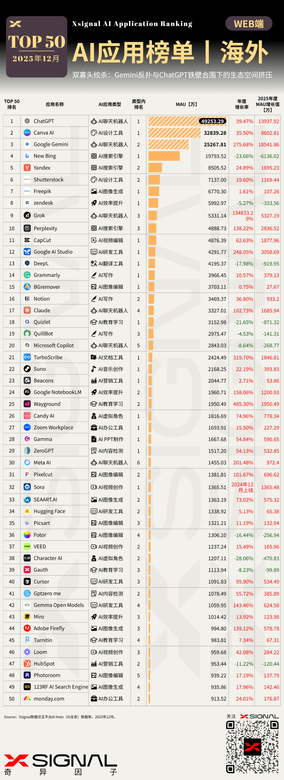 格局现状: 市场被 ChatGPT (No.1) 和 Google Gemini (No.3) 瓜分。虽然ChatGPT以 4.9亿 MAU (49253万) 稳居榜首,但增速放缓至 39%,在增量战争中,Google已悄然胜出。