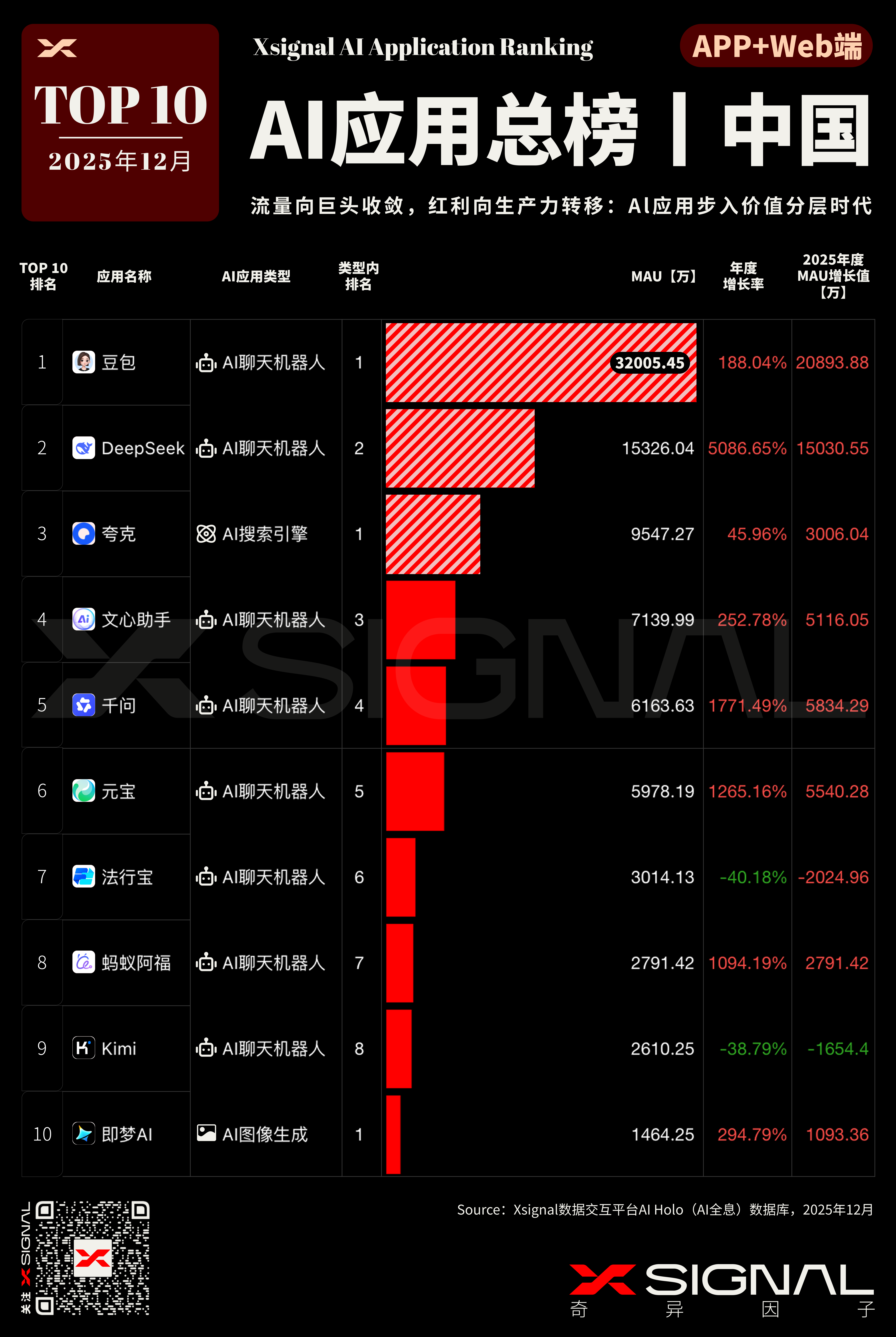 a. 断层式领先: 榜首豆包(MAU 2.79亿)已形成“超级APP”体量,其增量(1.88亿)甚至超过了第二名的总用户数。这证明了字节跳动“算法分发+强运营+全场景渗透”的打法已构建起极高的护城河。