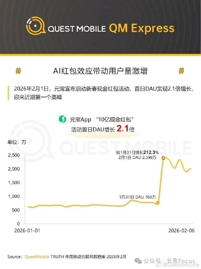 第三方机构QuestMobile发布的数据说,千问搞活动的第一天(2月6日),日活跃用户(DAU)直接窜升了7倍多。