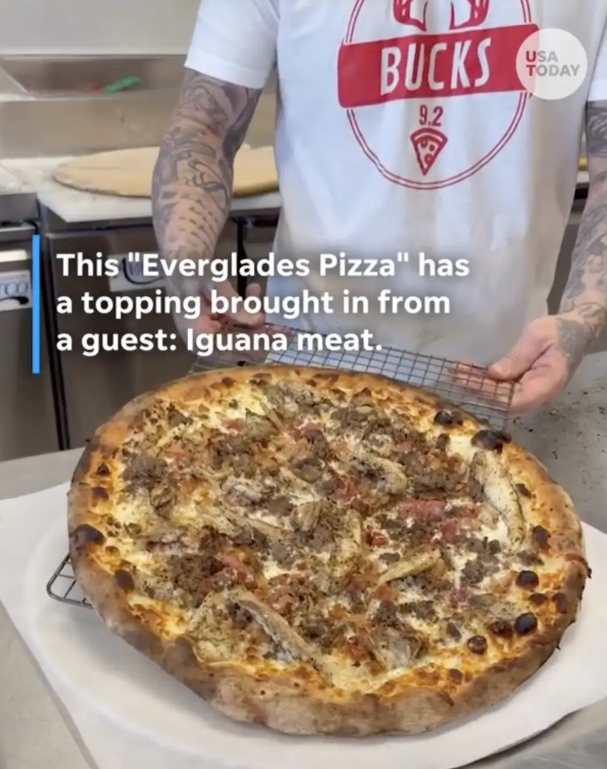 位于北棕榈滩的披萨店Bucks Coal Fired本周推出了一款鬣蜥披萨,并将其发布在Instagram上。经理 Franky 将其称为“大沼泽地披萨”。